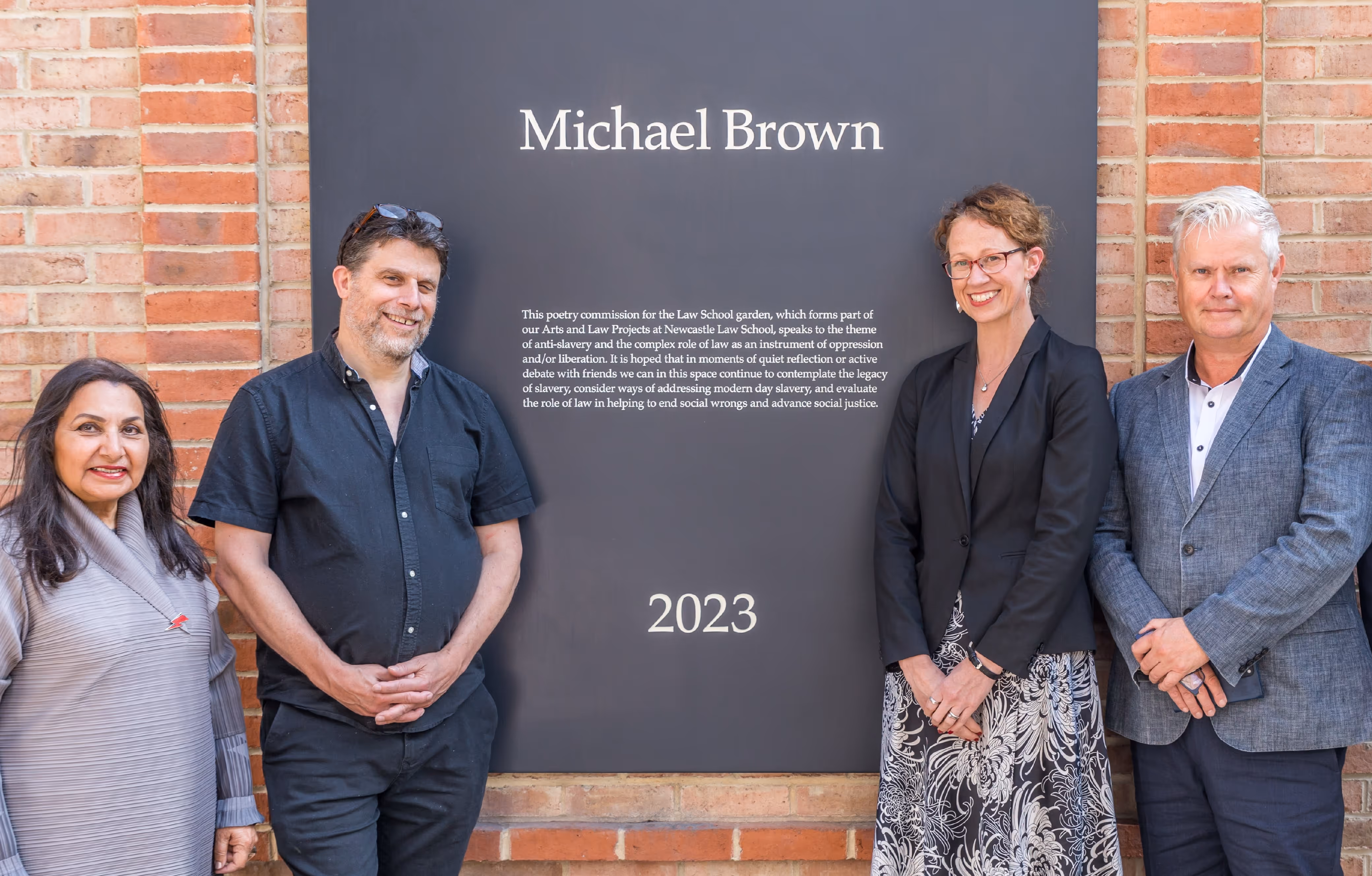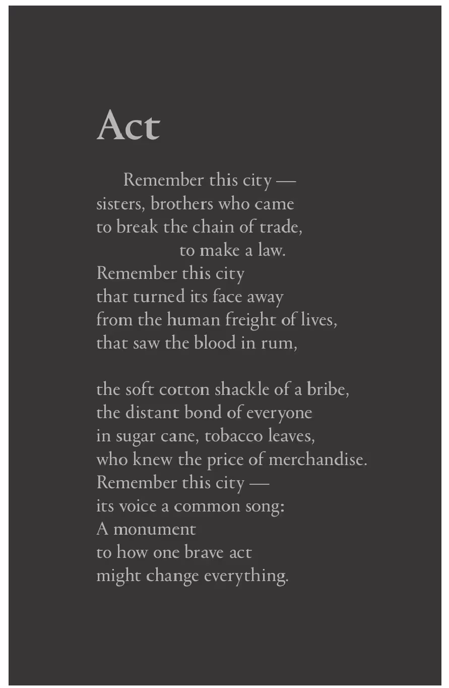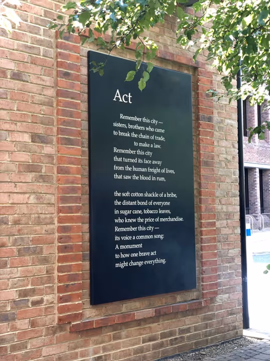 2023 marked 100 years of teaching law and 60 years of Newcastle Law School graduates and Michael Brown's poetry commission helped celebrate and mark these milestones with his poem 'Act' which speaks to the theme of anti-slavery and the complex role of law as an instrument of oppression and/or liberation. 'Act' references Grey's Monument in Newcastle which commemorates Charles Grey, 2nd Earl Grey, who was Prime Minister during the passage of the Great Reform Act of 1832 which expanded the electorate, allowing more people to vote, which then influenced the subsequent abolition of slavery.