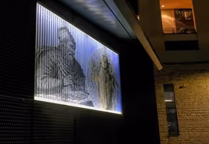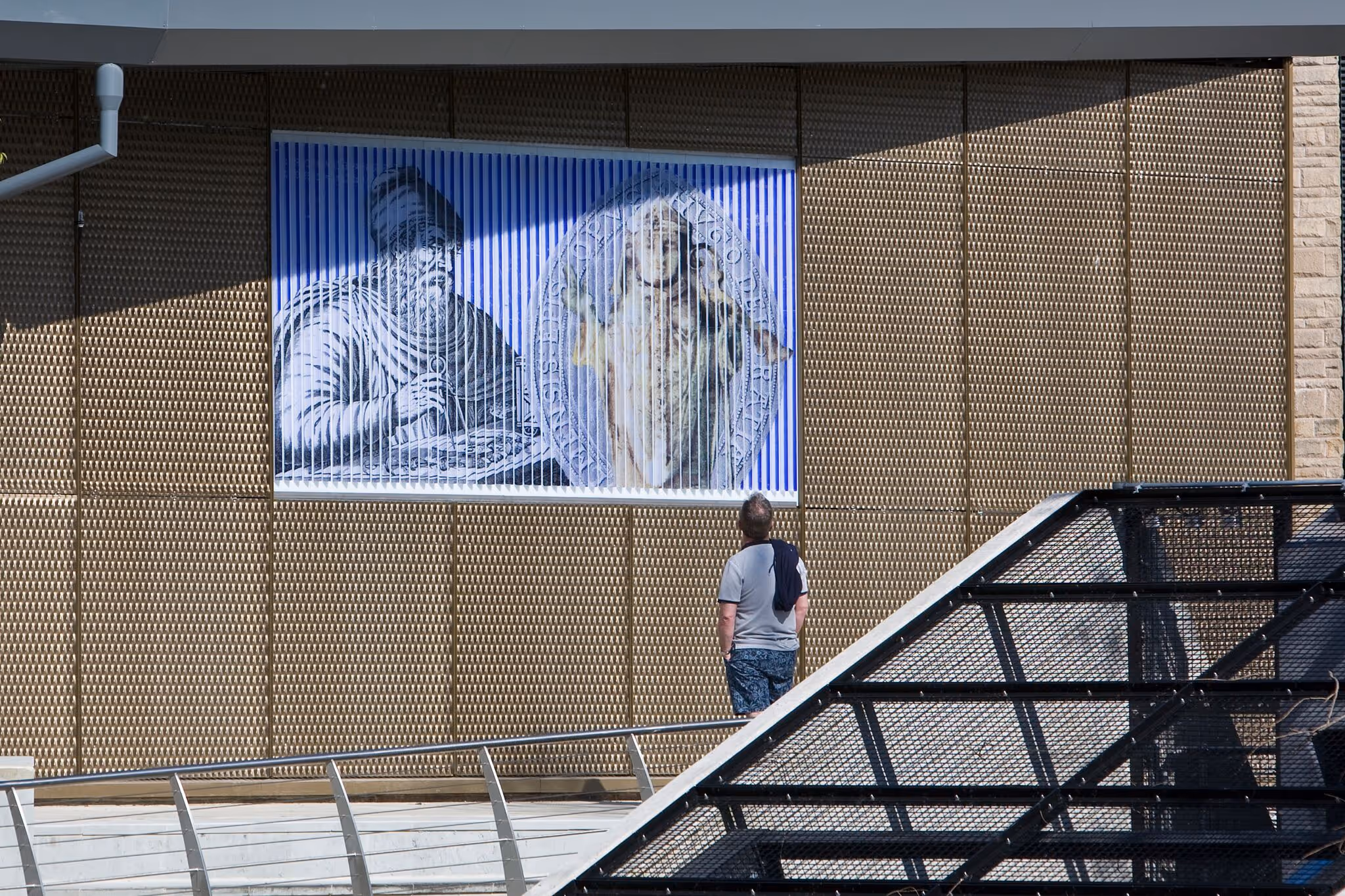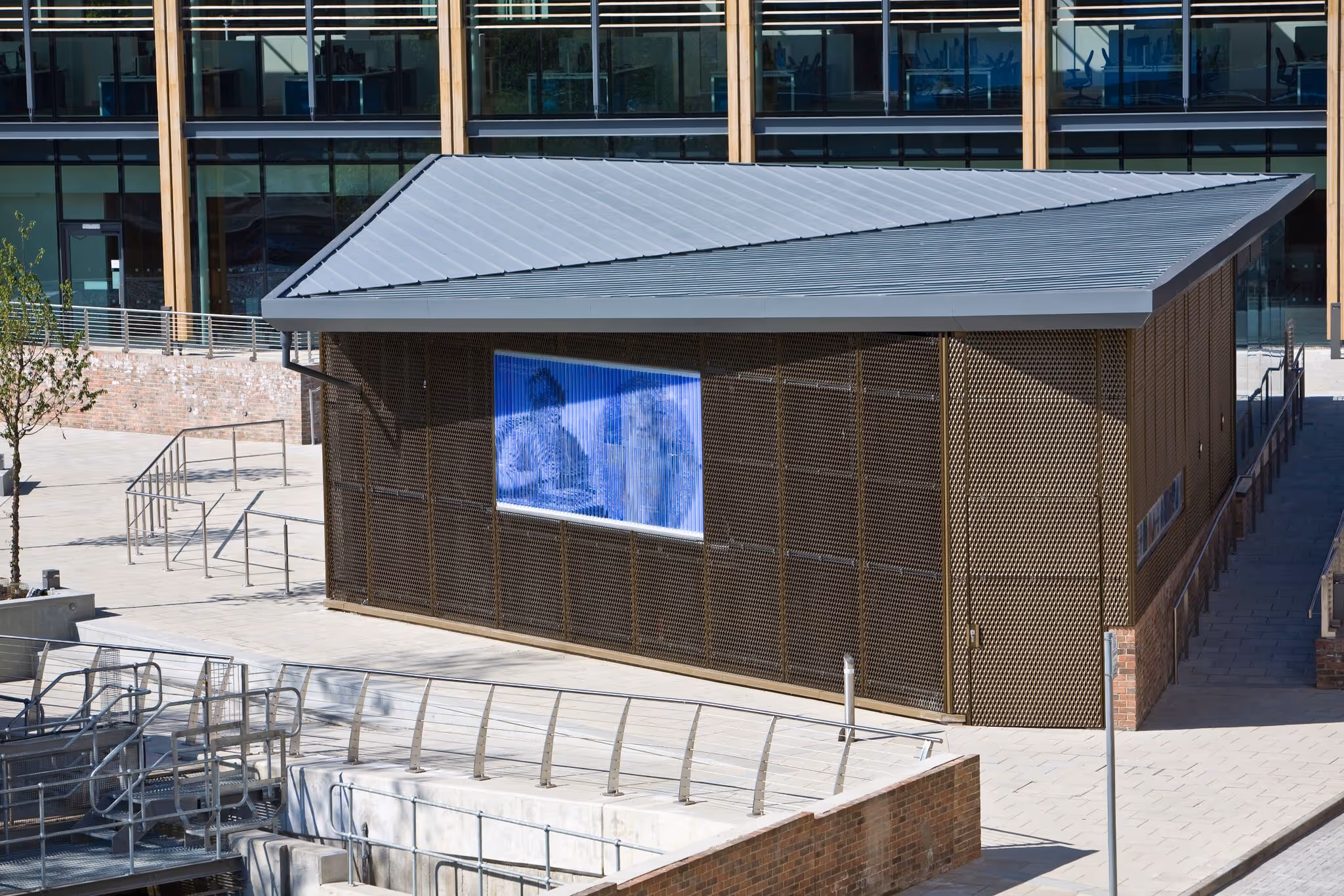 Four long glass panels display Jeffrey’s ‘Durham Mill Encyclopaedia’ of landmark moments in the site’s history. On the other site lenticular glass prisms reveals an image of the Archimedean screw when viewed from one angle and an image of Archimedes and Durham Bishop Hugh De Puiset when viewed from the other angle.