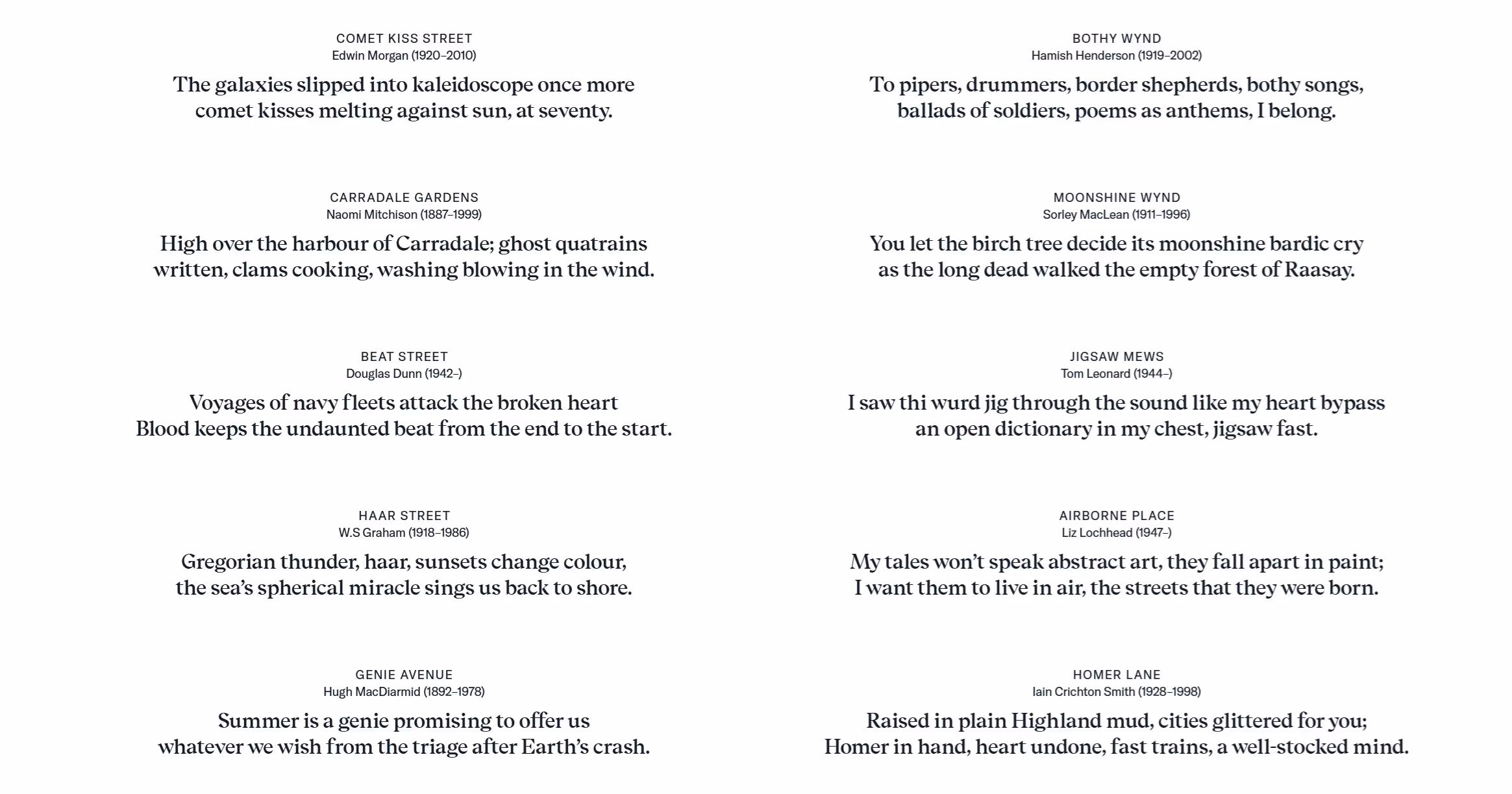 Janette said: "I wrote the naming strategy working with the lives of twelve leading Scottish poets as impetus. The stanza, or poem, for the sign comes first, capturing a poet’s personality, style or ethos, then the extraction of the word from the couplet to create the street name. Street names reflect realities, offer contemplation in pedestrian spaces, dialogue in public spaces, from the deeply abstract or satirically literal, both often correlated to a site-specific story. The legacy of the poets is also a site-specific story. I wanted the street names to reflect their cultural background, to serve as evidence of social history and social geography through the eyes of the poets, these were the themes they dedicated their voice to after all".