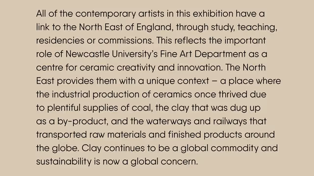 All of the contemporary artists in this exhibition have a link to the North East of England, through study, teaching, residencies or commissions. This reflects the important role of Newcastle University’s Fine Art Department as a centre for ceramic creativity and innovation. The North East provides a special context – a place where the industrial production of ceramics once thrived due to plentiful supplies of coal, where clay that was dug up as a by-product, and the waterways and railways then transported raw materials and finished products around the globe. Clay continues to be a global commodity and sustainability is now a global concern.