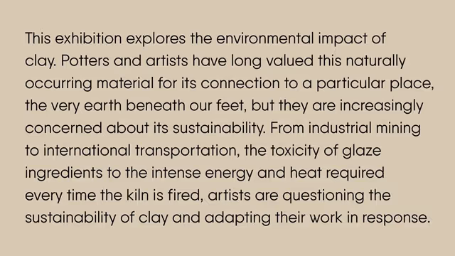 Sustainable Clay explored the environmental impact of this naturally occurring material. Potters and artists have long valued clay for its connection to a particular place, the very earth beneath our feet, but they are increasingly concerned about the sustainability of this material. From industrial mining to international transportation, the toxicity of glaze ingredients to the intense energy and heat required every time the kiln is fired, contemporary artists are questioning the sustainability of clay and adapting their work in response.