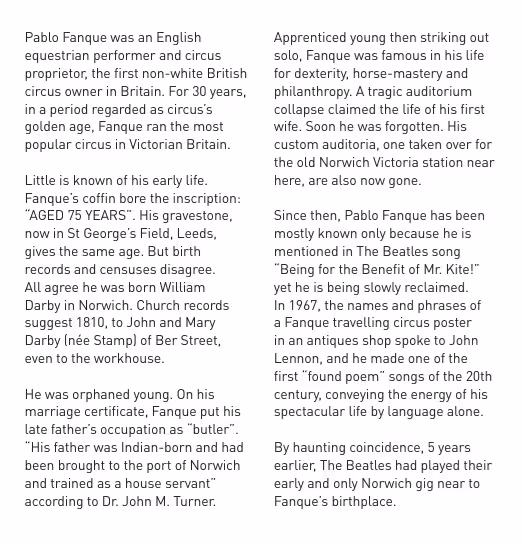 Ira Lightman's poem tells the story of Britain's first Black circus owner Pablo Fanque (who was born nearby) and the poem can be sung to the Beatles song ' For the Benefit of Mr Kite'. John Lennon found a circus poster in an antique shop and based the song on the performers mentioned on the poster, including 'Pablo Fanque's Fair', and the song was features on the Beatles Sgt Pepper album.