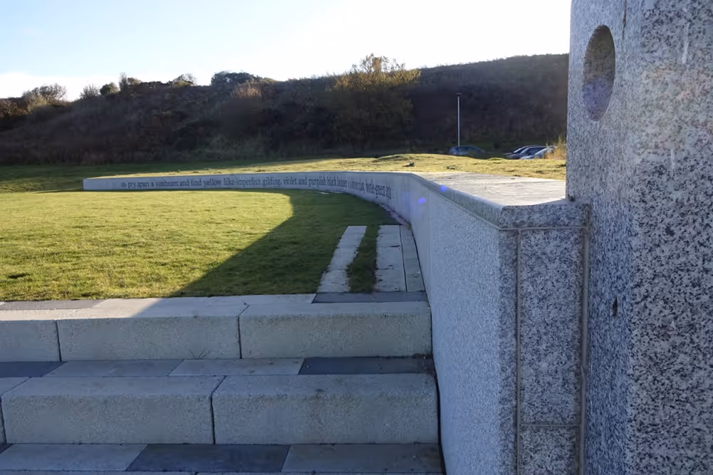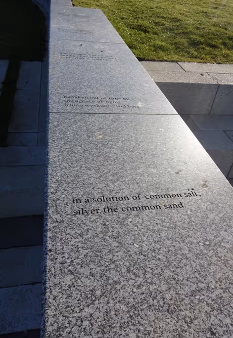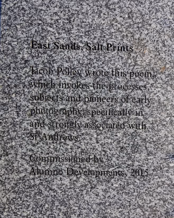 I worked with poet Jacob Polley, who was lecturing at St Andrews University, to engage him on the project before construction began and his commissioned poem evokes the processes and subjects of early photography, specifically in and strongly associated with St Andrews. The poem is engraved into granite seating in a new public space overlooking East Sands Bay in St Andrews with a large line of text visible to people using the coastal footpath and smaller stanzas to be discovered when people sit on the granite. Jacob went onto be awarded the 2016 TS Eliot Prize for poetry for his collection, Jackself.