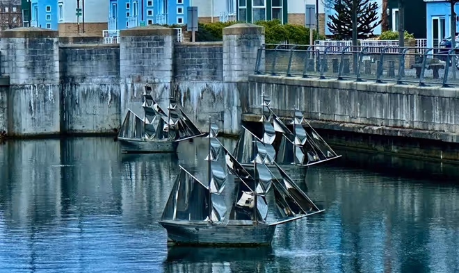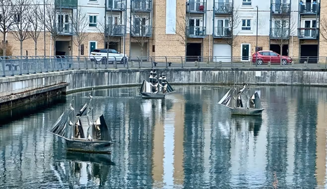 We then were able to commission Irene to create a further work in 2004. Fleet took the collier brig image further with a series of kinetic stainless steel sculptures sited in the flooded drydock and fixed on pivot bearings so that the sculptures can move with the direction of the wind.