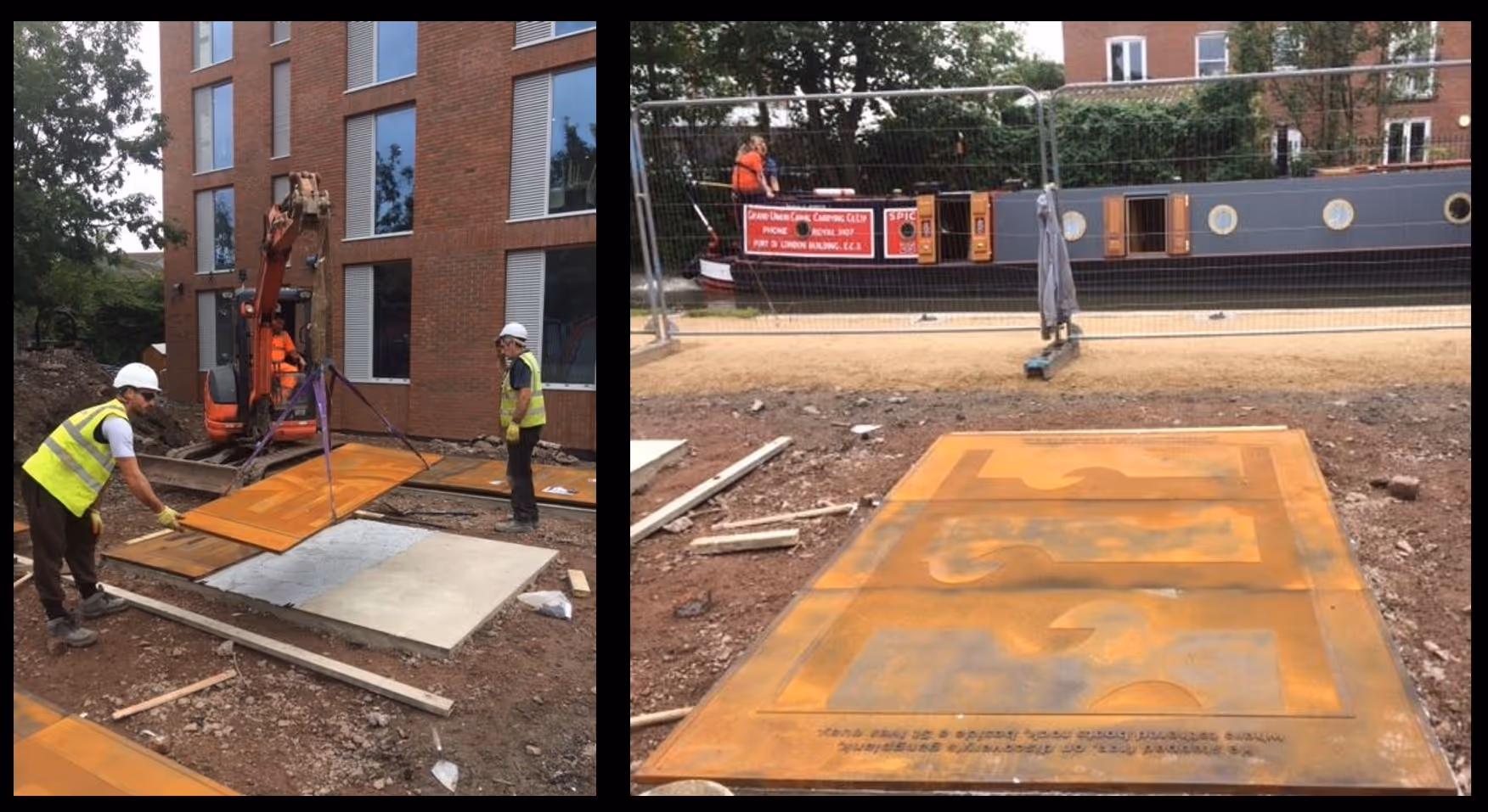 The site is by the Grand Union Canal and I had researched that the Eagle Foundry had operated on the opposite side of the canal and my proposal for Alumno's development comprised of four large cast-iron floor plates based on Sir Terry’s paintings, together with a series of colourful screen-prints in the atrium of the new building. We worked with Terry's son Anthony Frost who advised on the imagery and recommended poet Bob Deveraux to work on the commission as he had known Terry in St Ives. Both the cast iron floorplates and atrium prints are bordered by a specially commissioned poem by Bob Deveraux describing Sir Terry’s early life in Leamington Spa and his journey to become one of Britain’s most recognisable abstract painters. The cast-iron plates are set within a newly designed pocket park named ‘Terry Frost Space”, which can be used by local residents and people enjoying the canal-side walks.