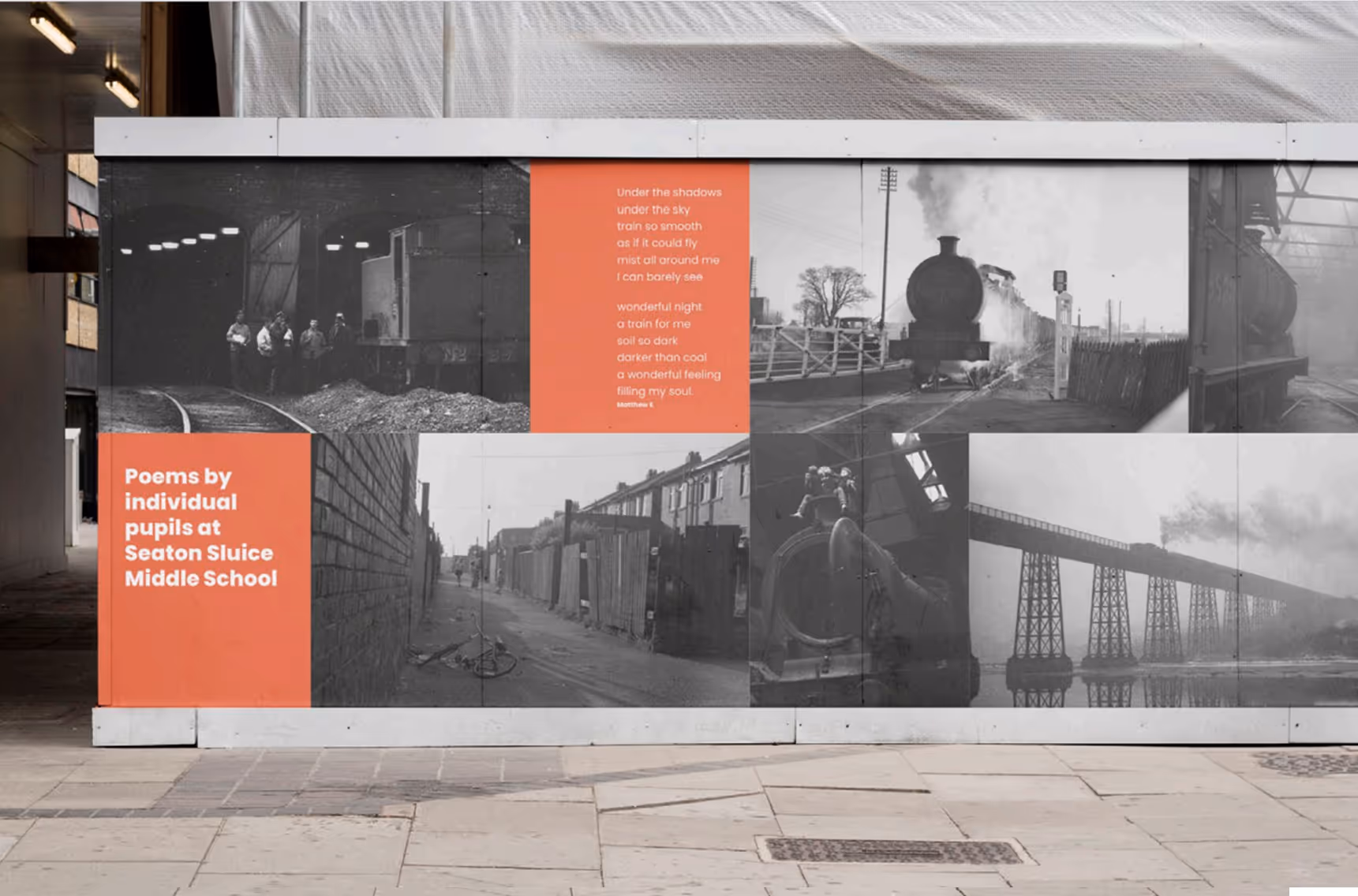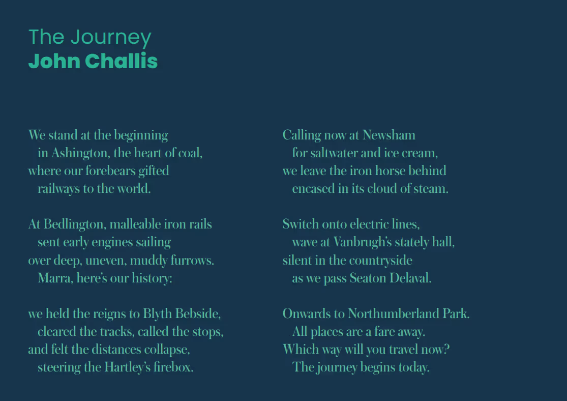 I was commissioned to write a cultural plan for the new Northumberland Railway Line and produced a set of ideas for the six new stations including a specially commissioned poem by John Challis and a heritage based portrait photography project with both artists working with local schools. The photography and poem were used on site hoardings during construction.