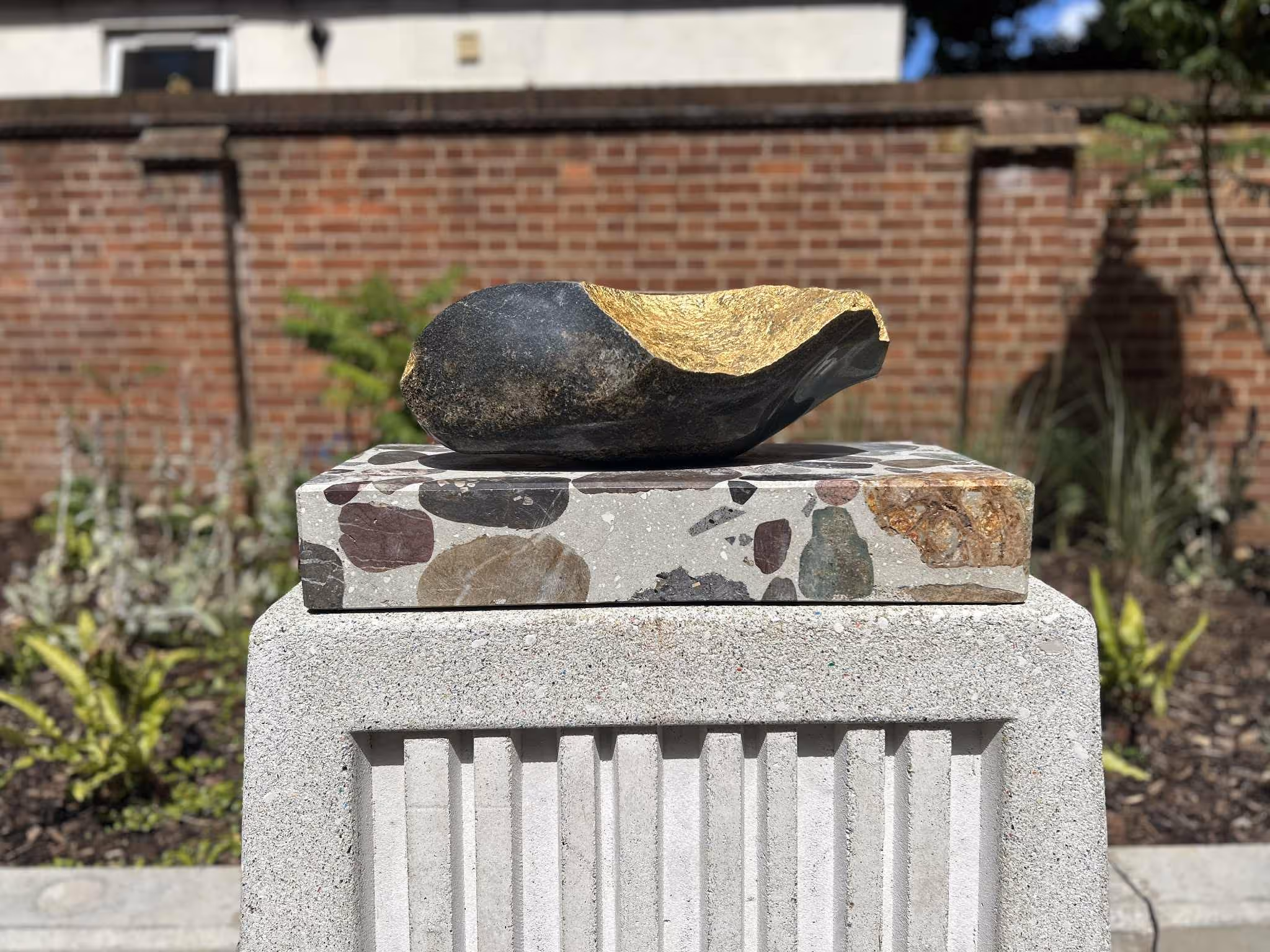 Russell Coleman created jewel-like gilded sculpture with recycled stone and also made the poetry panels for Casey Bailey's commissioned poem with a combination of recycled blast furnace slag and brass letters.