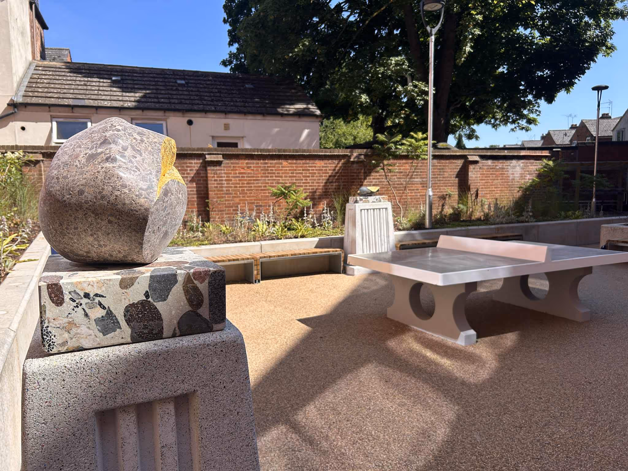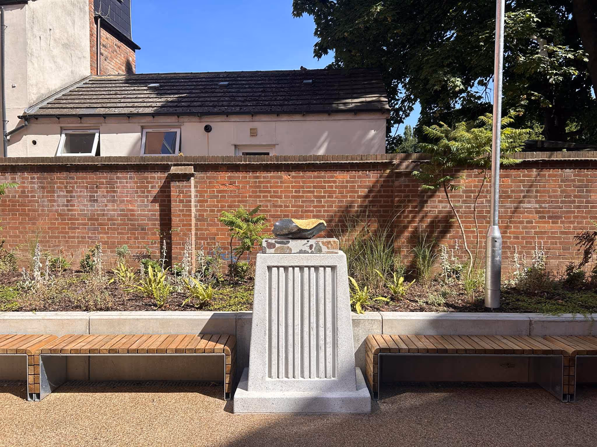 Born out of a creative arts workshop experiment, Total Wasters takes one set of problems to solve another. The use of primary sourced sand and aggregate within concrete production dramatically increases the carbon footprint of the material. We have looked to utilise waste plastics and glass from recycling centres to provide an alternative to carbon heavy aggregates needed in concrete production. In turn we have found a home for problematic post recycling waste plastic fibres and low-grade glass cutlet which would otherwise have been incinerated or left in landfill. Total wasters uses industrial by product cement alternatives as a binder to further reduce the carbon footprint. In the case of the Pershore Junction project we have used Ground Granulated Blast Furnace Slag or GGBS. The sculpture bases and poem plaques have used over 2 ton of waste bottle bank glass and and ground slag from steel production, 100kg of waste polypropylene and polyethene that are the “tailings” or unrecycleable waste from a plastics recycling plant.